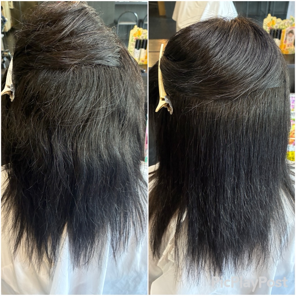 本日のお客様 40代 女性 新規のお客様(ホームページを見て高速で1時間以上かけて来てくれました) 他店にて10ヶ月位前に縮毛矯正 矯正部分チリついてる(前回の矯正でチリついてるのか毎日180℃でアイロンかけてるらしいのでそれでチリついてるのかは不明) 中間から毛先のビビリ毛は傷んでのビビリは綺麗にならない可能性がある事を説明させて頂き施術させていただきました。