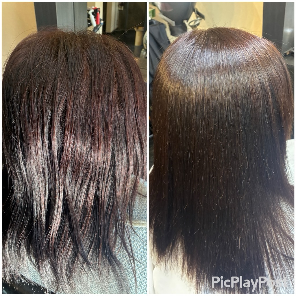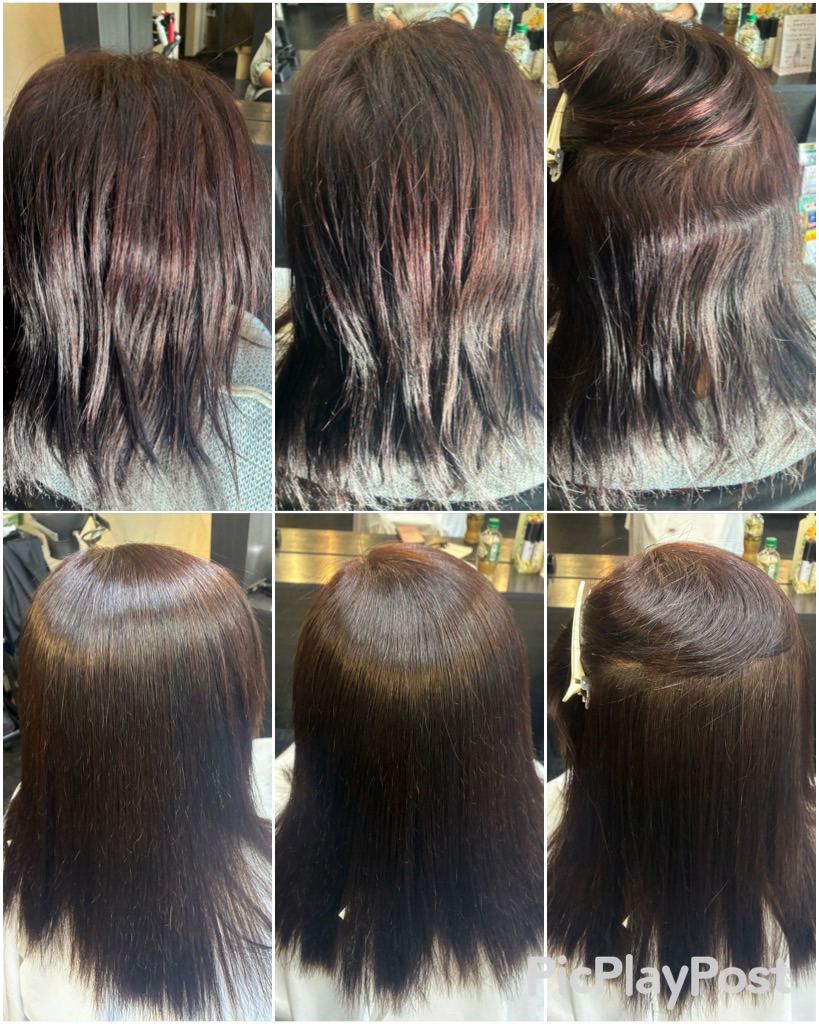 履歴が複雑でかなり痛んでいたんですが中間から毛先のチリつきも収まり綺麗に仕上がりました。とても喜んでいただけました。