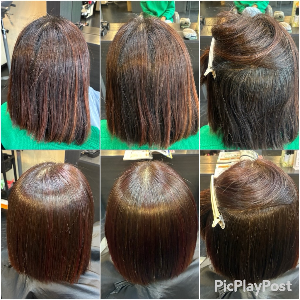 既存のお客さま 6ヶ月前に当店にてストレート ホームカラー(顔まわりリタッチ)2回 前回のストレートが綺麗に伸びているので写真では綺麗に見えるが全体的に大きめのウネリとチリつき ホームカラー部分がダメージする可能性などのリスクもお話しさせて頂きました。